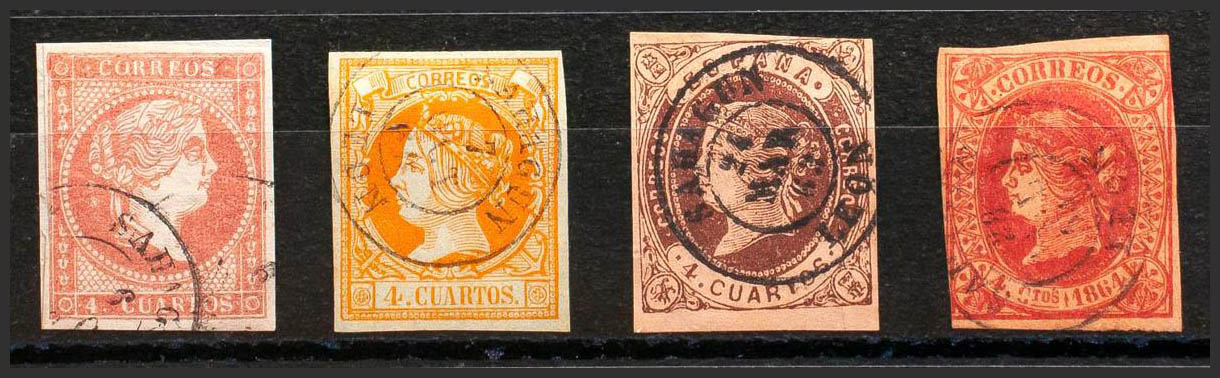 48, 52, 58, 64. (1855ca). Set of four 4- cuartos stamps red, yellow, brown and pink, unused with SAHAGUN / LEON postmark. MAGNIFICENT.