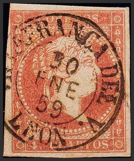 48. 1855. 4 cuartos red. Postmark VILLAFRANCA DEL V. / LEON (Type I). MAGNIFICENT AND RARE.