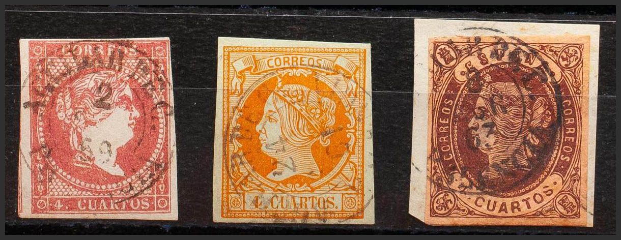 48, 52, 58. (1855ca). Set of three 4- cuartos red, yellow and brown stamps, unused with AGUILAR DE C. / PALENCIA (Type I) postmark (in bluing on the yellow 4- cuartos ). MAGNIFICENT.