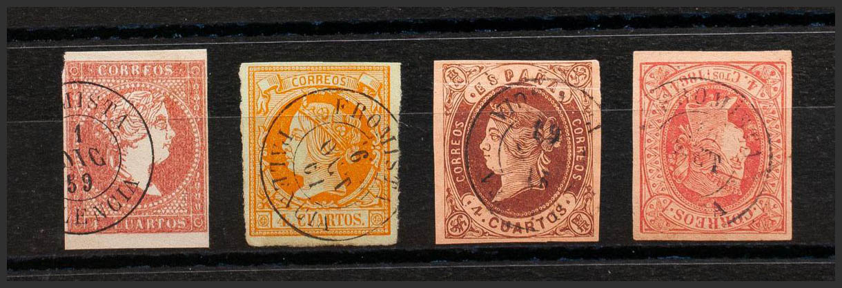 48, 52, 58, 64. (1855ca). Set of four 4- cuartos stamps red, yellow, brown and pink, unused with FROMISTA / PALENCIA postmark. MAGNIFICENT.