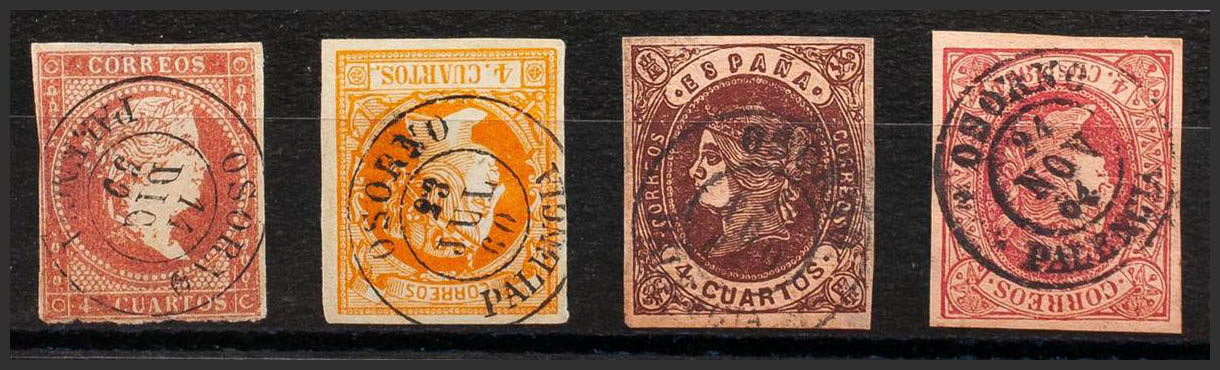 48, 52, 58, 64. (1855ca). Set of four 4- cuartos red, yellow, brown and pink stamps, unused with OSORNO / PALENCIA postmark. MAGNIFICENT.