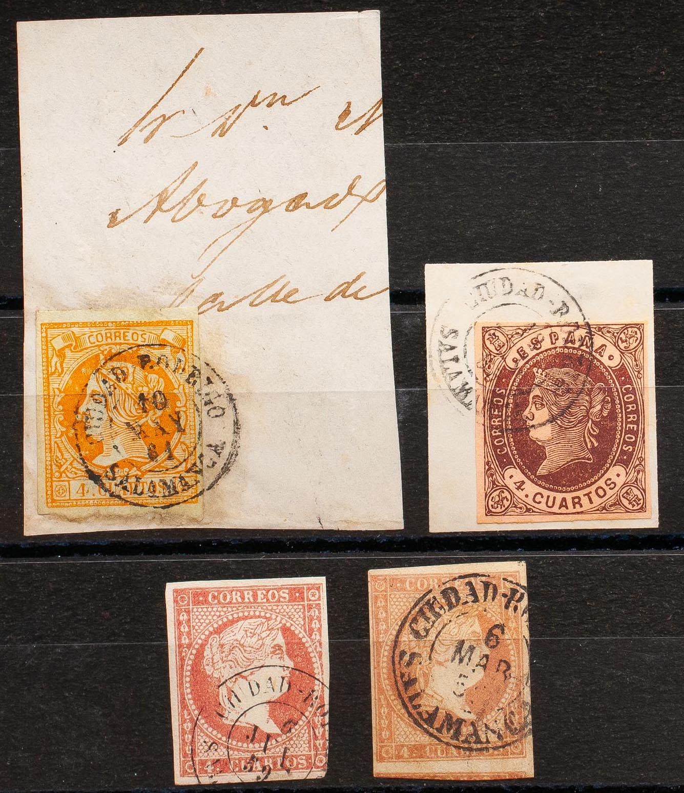 48(2), 52, 58. (1855ca). Set of four stamps of the 4 cuartos red, yellow, brown and red, unused with CIUDAD-RODRIGO / SALAMANCA postmark (including Type I on the 4 cuartos red). MAGNIFICENT.