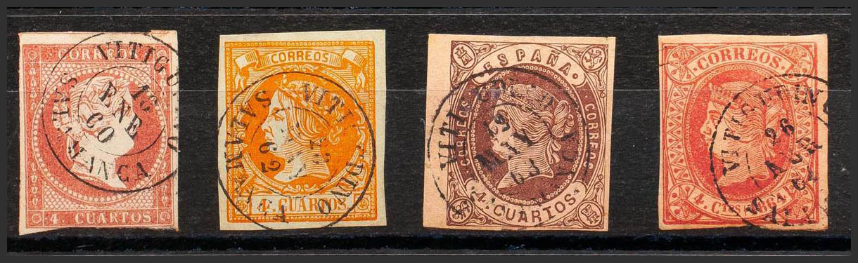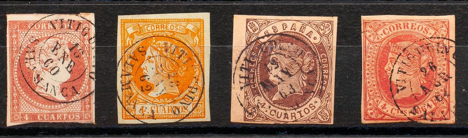 48, 52, 58, 64. (1855ca). Set of four 4- cuartos stamps red, yellow, brown and pink, unused with VITIGUDINO / SALAMANCA postmark. MAGNIFICENT.