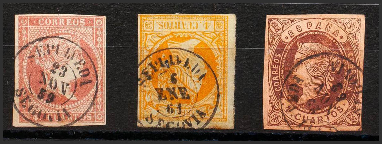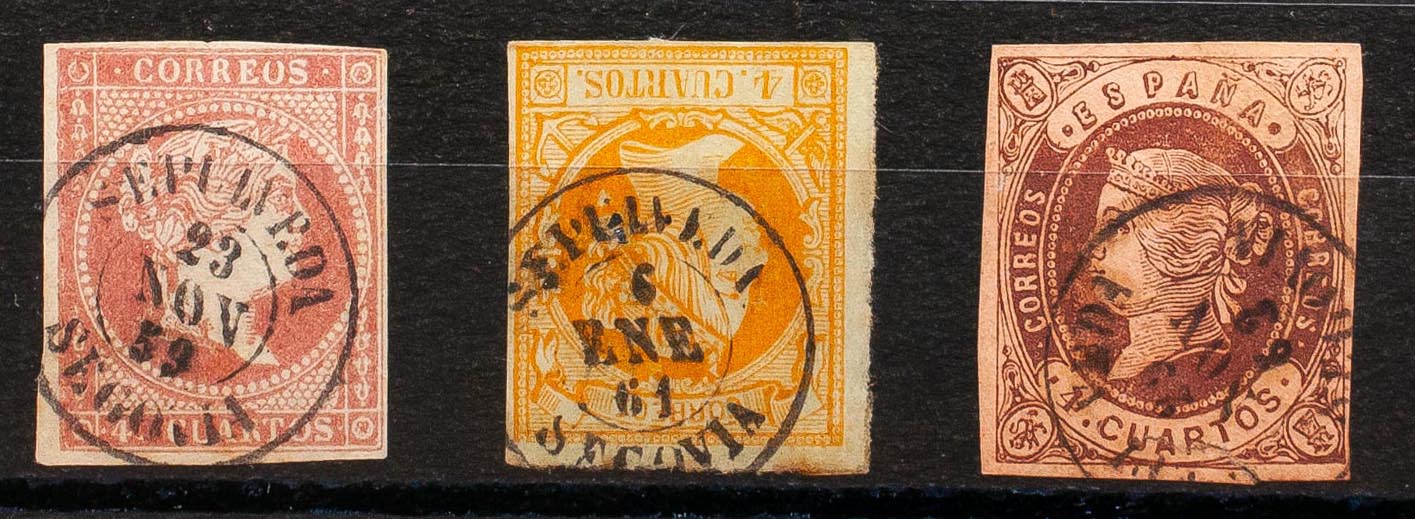 48, 52, 58. (1855ca). Set of three 4- cuartos red, yellow and brown stamps, unused with the SEPULVEDA / SEGOVIA postmark. MAGNIFICENT.