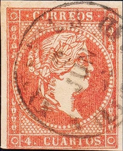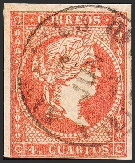 48. 1855. 4 cuartos red. Postmark MOTA DEL M. / VALLADOLID (Type I). BEAUTIFUL AND RARE.