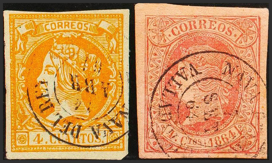 52, 64. (1860ca). Set of two stamps of 4 cuartos yellow and 4 cuartos pink, unused with NAVA DEL REY / VALLADOLID postmark. MAGNIFICENT.