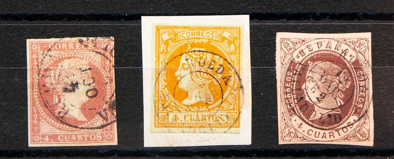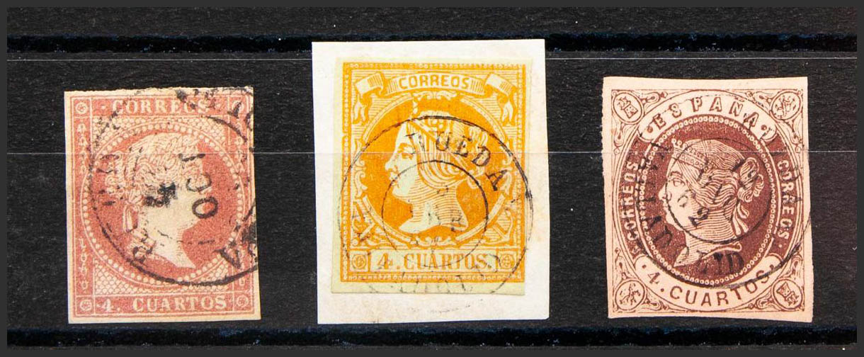 48, 52, 58. (1855ca). Set of three 4- cuartos red, yellow and brown stamps, unused with RUEDA / VALLADOLID postmark (Type I in the 4- cuartos red). MAGNIFICENT.