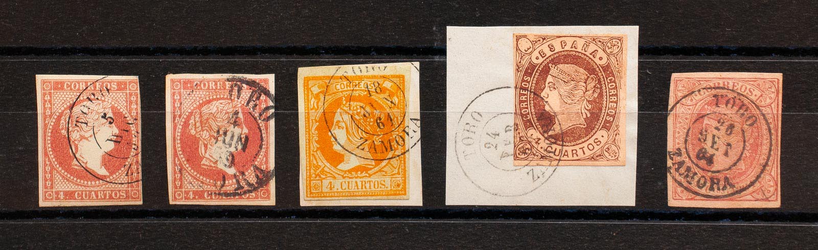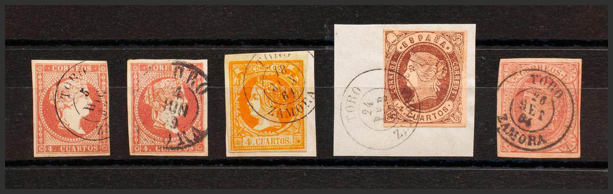 English 48(2), 52, 58, 64. (1855ca). Set of five 4- cuartos red, yellow, brown and pink stamps, unused with the TORO / ZAMORA postmark (including Type I on the 4- cuartos red). MAGNIFICENT.