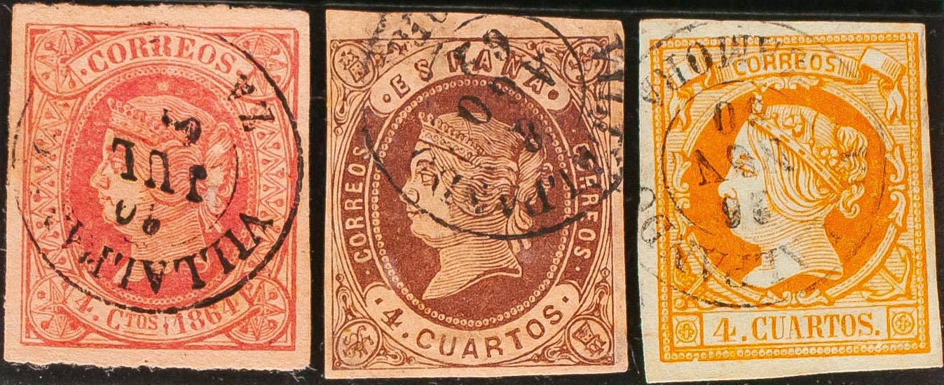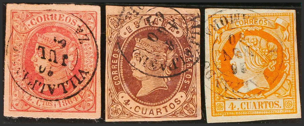 52, 58, 64. (1860ca). Set of three 4- cuartos yellow, brown and pink stamps, unused with the VILLALPANDO / ZAMORA postmark. MAGNIFICENT.