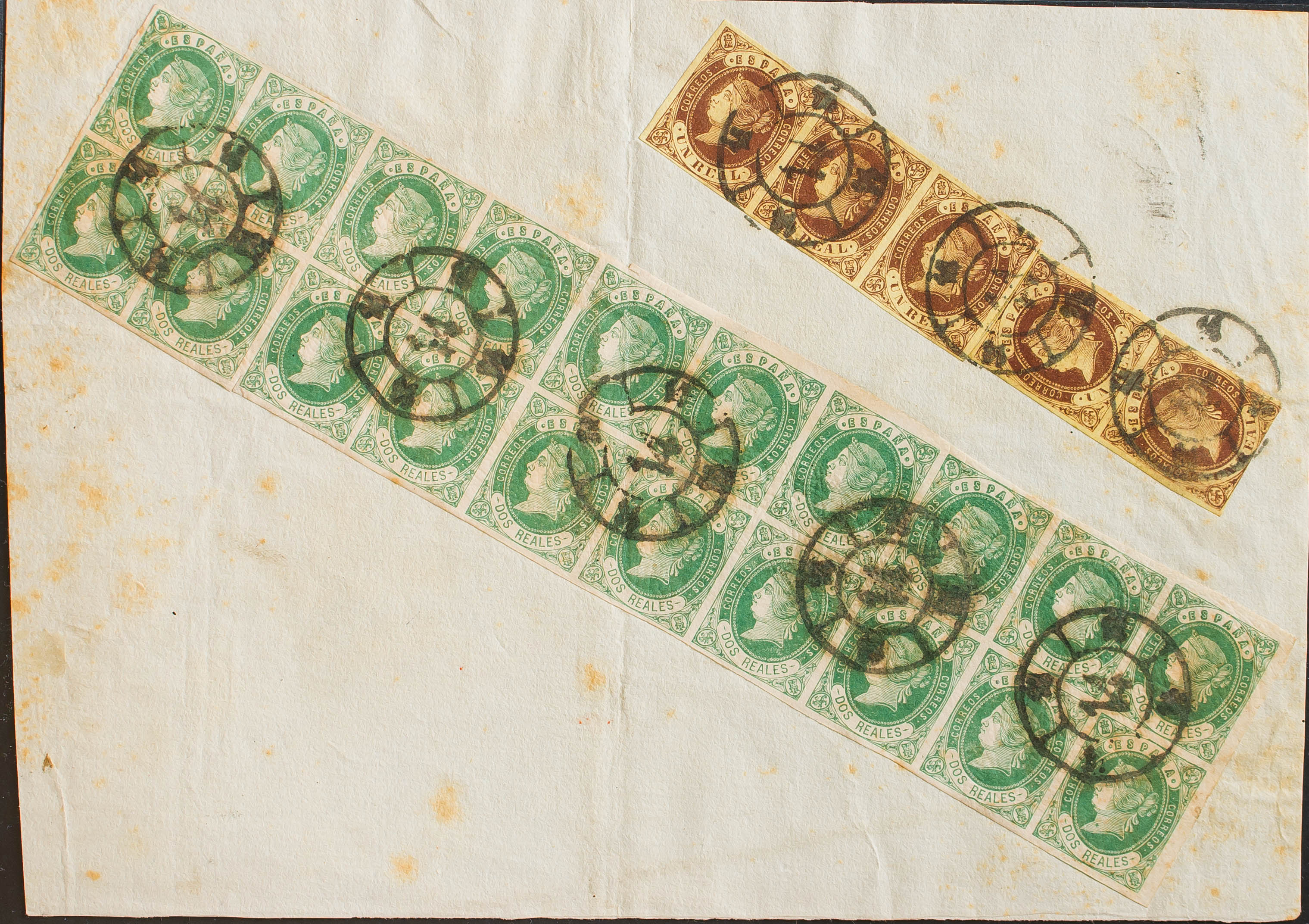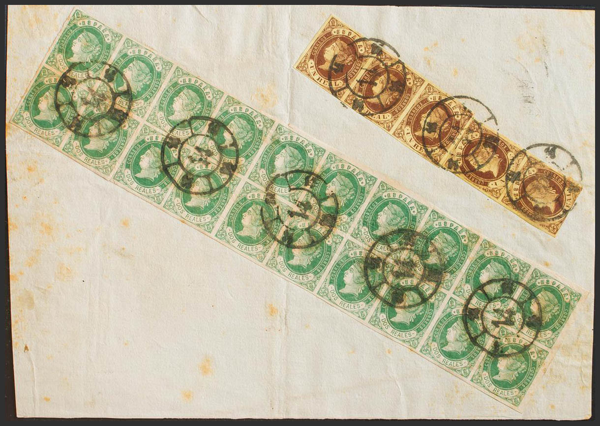 △ 61(5), 62(20). 1862. 1 real chestnut, strip of three and a couple and 2 reales green, block of twenty, on fragment. Postmark R. CARRETA Nº14. MAGNIFICENT AND RARE, SPECTACULAR AND EVEN MORE WITH THIS EXCEPTIONAL QUALITY.