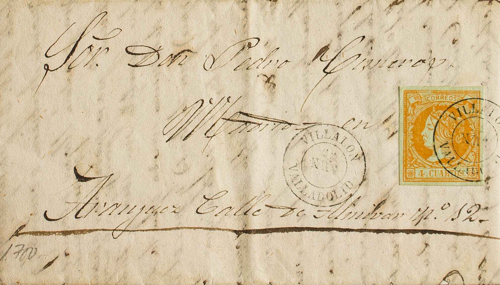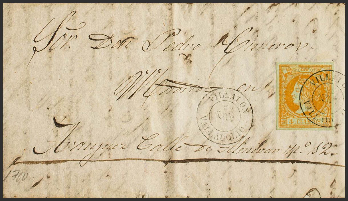 52. 1861. 4 cuartos yellow. FUENTIHOYUELO (VALLADOLID) to ARANJUEZ. Postmark VILLALON / VALLADOLID. MAGNIFICENT AND UNUSUAL, ESPECIALLY IN THIS QUALITY.