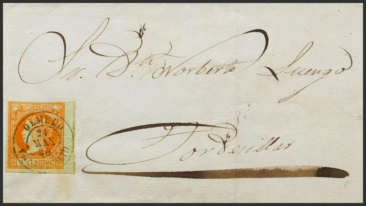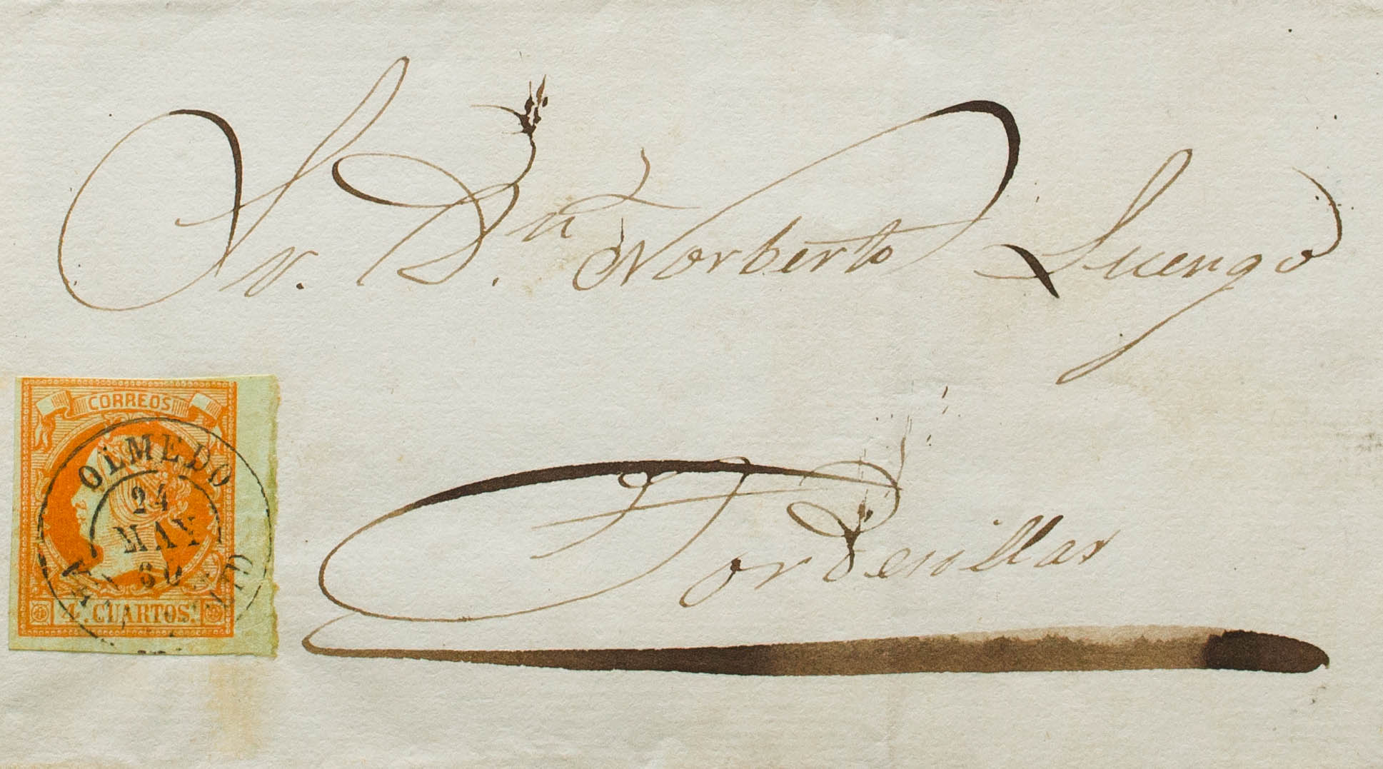 English 52. 1860. 4 orange cuartos , leaf edge. OLMEDO to SEVILLE. Postmark OLMEDO / VALLADOLID. MAGNIFICENT AND RARE.