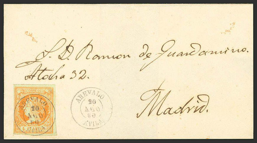 English 52. 1860. 4 cuartos yellow. AREVALO to MADRID. Postmark AREVALO / MADRID. MAGNIFICENT.