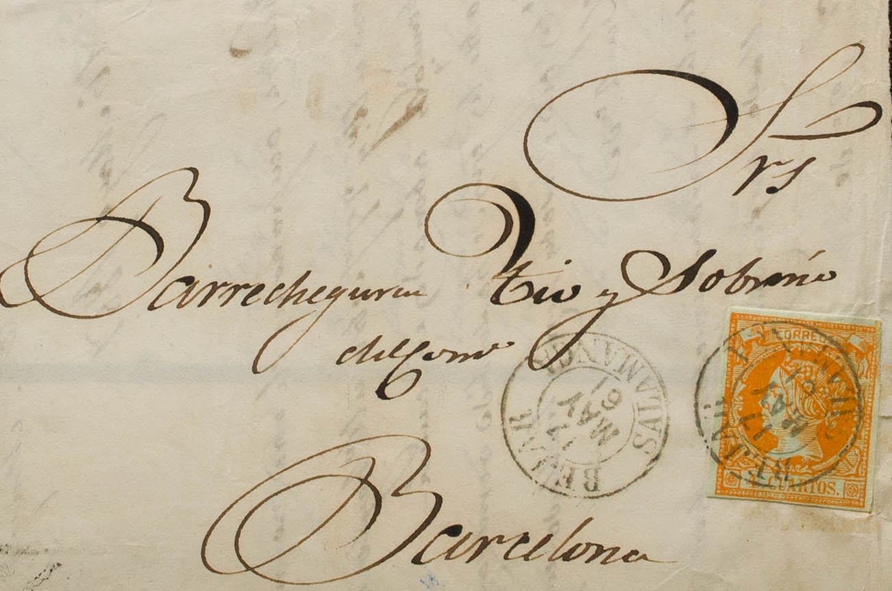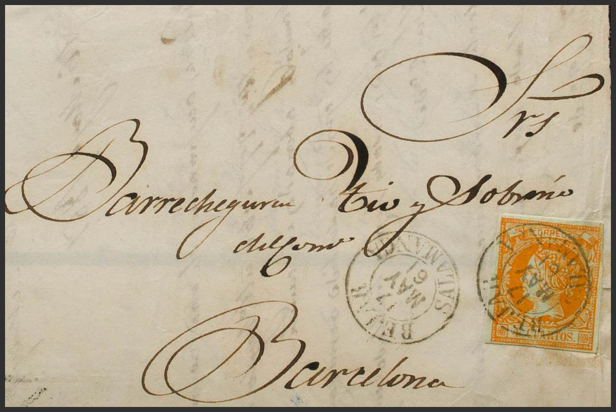 English 52. 1861. 4 orange cuartos . BEJAR to BARCELONA. Postmark BEJAR / SALAMANCA (Type I). MAGNIFICENT.