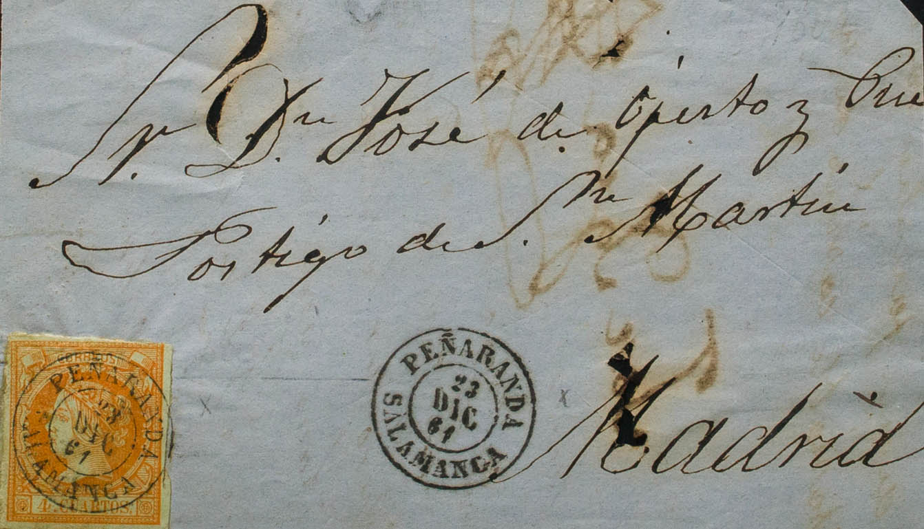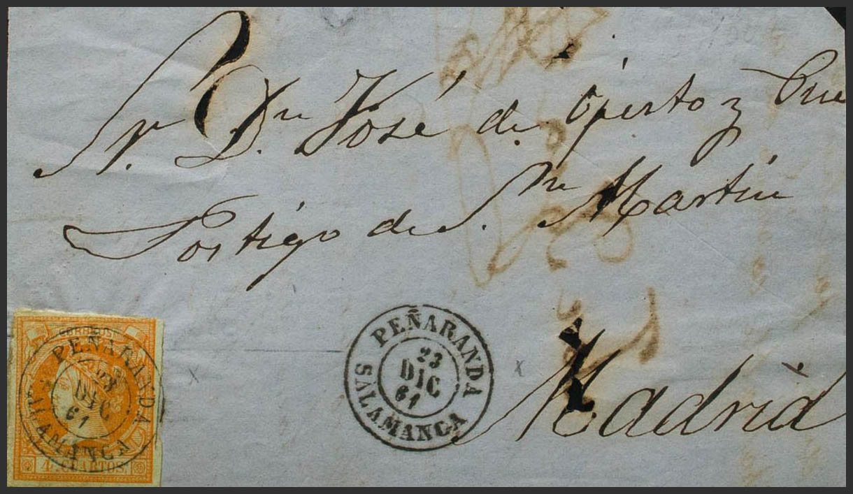 52. 1861. 4 orange cuartos . Front from PEÑARANDA DE BRACAMONTE to MADRID. Postmark PEÑARANDA / SALAMANCA. PRETTY.