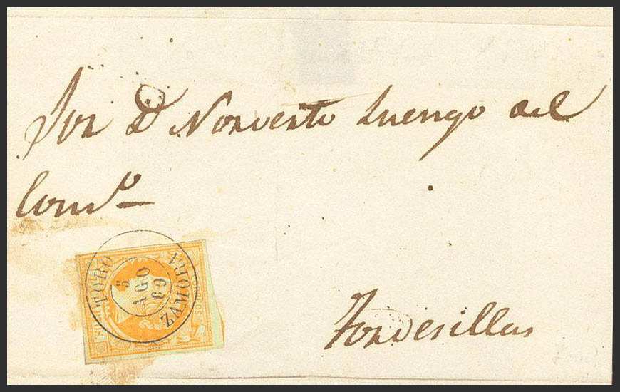 52. 1860. 4 cuartos yellow. BULL to TORDESILLAS. TORO / ZAMORA postmark. MAGNIFICENT.