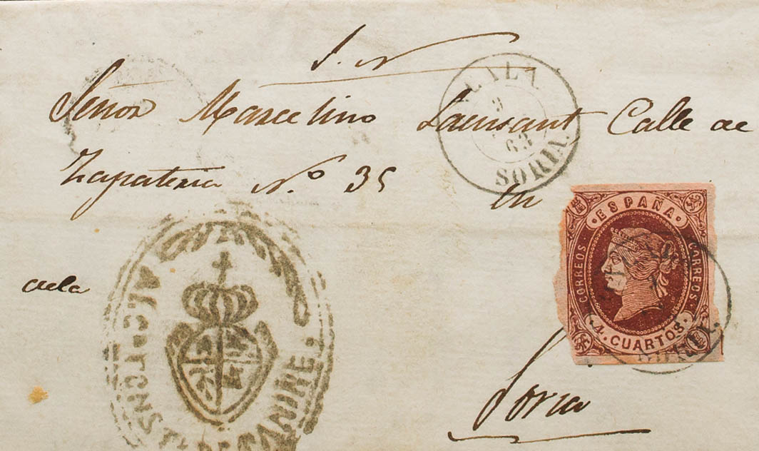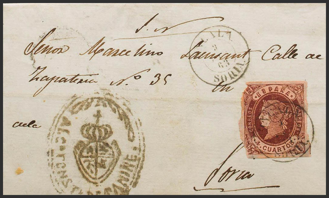 58. 1863. 4- cuartos chestnut. TANIÑE to SORIA. Postmark ONCALA / SORIA. MAGNIFICENT AND RARE.
