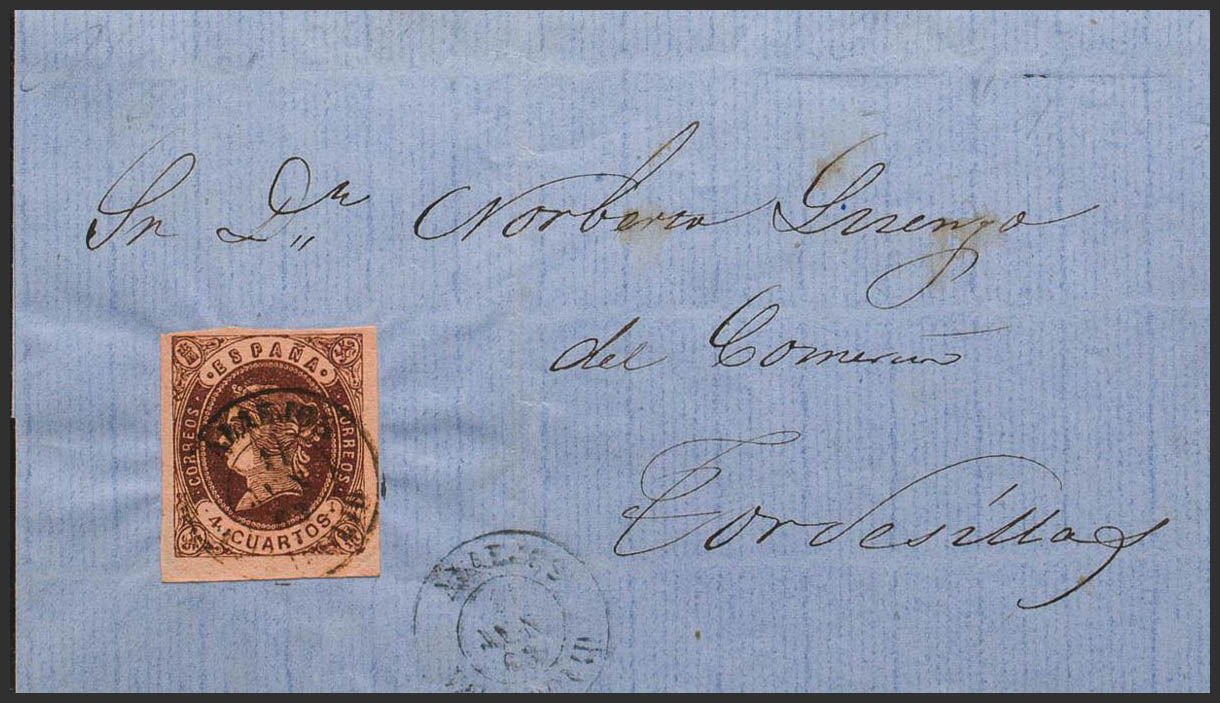 English 58. 1863. 4- cuartos chestnut. ALAEJOS to TORDESILLAS. Postmark ALAEJOS / VALLADOLID. MAGNIFICENT.