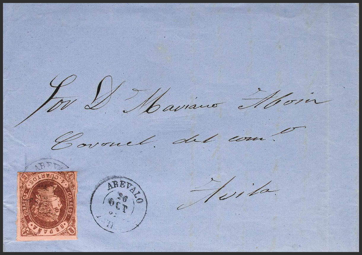 58. 1863. 4- cuartos chestnut. AREVALO to AVILA. Postmark AREVALO / AVILA. MAGNIFICENT.