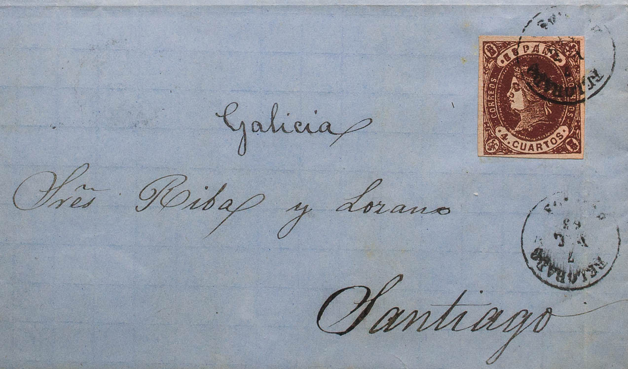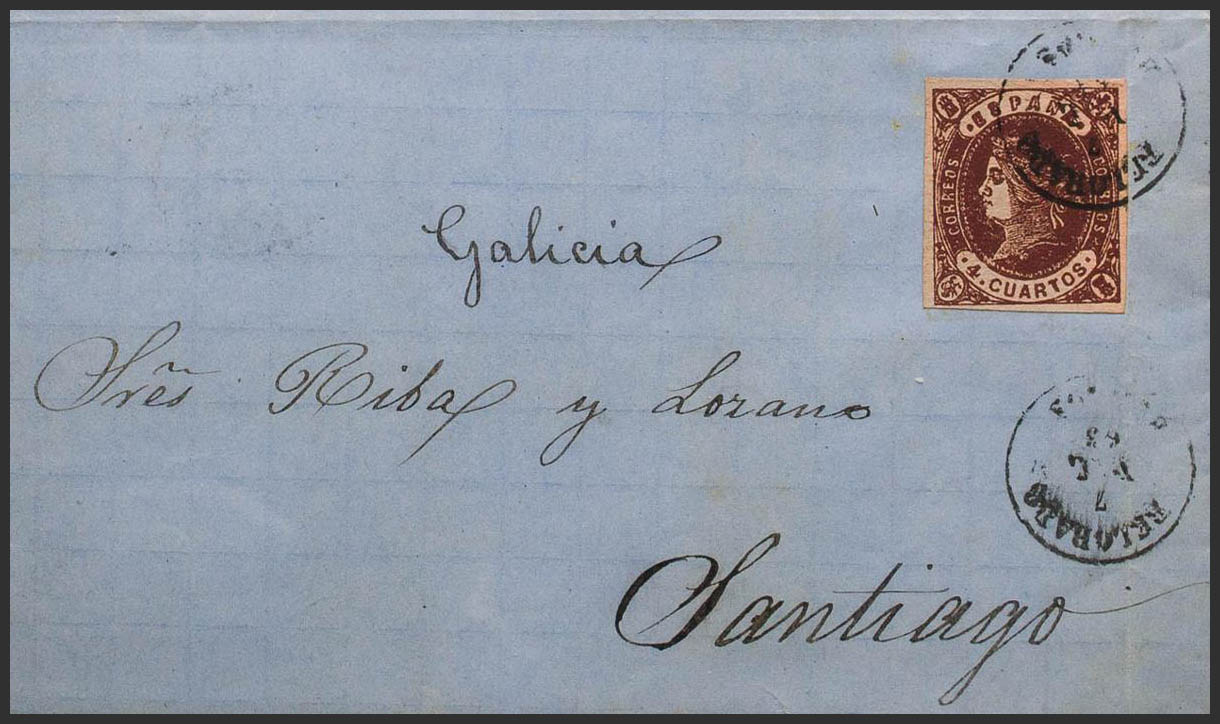 English 58. 1863. 4- cuartos chestnut. PRADOLUENGO (BURGOS) to SANTIAGO. Postmark BELORADO / BURGOS. MAGNIFICENT AND VERY RARE.