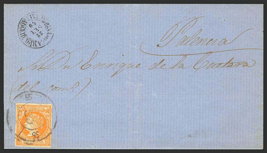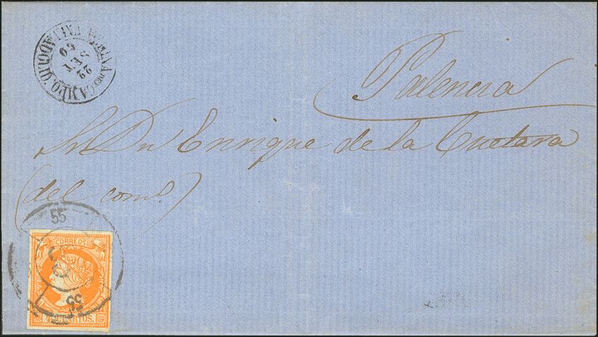 52. 1860. 4 cuartos yellow. MEDINA DEL CAMPO to PALENCIA. Postmark R. CARRETA Nº 55.