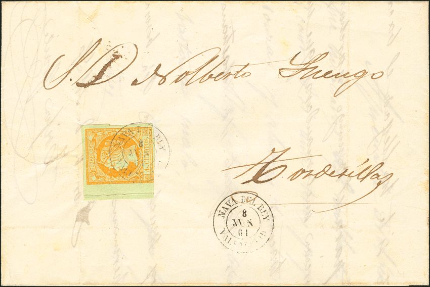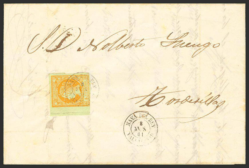 English 52. 1861. 4 cuartos yellow, leaf edge. NAVA DEL REY to TORDESILLAS. Postmark NAVA DEL REY / VALLADOLID. NICE.