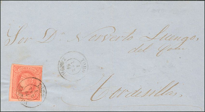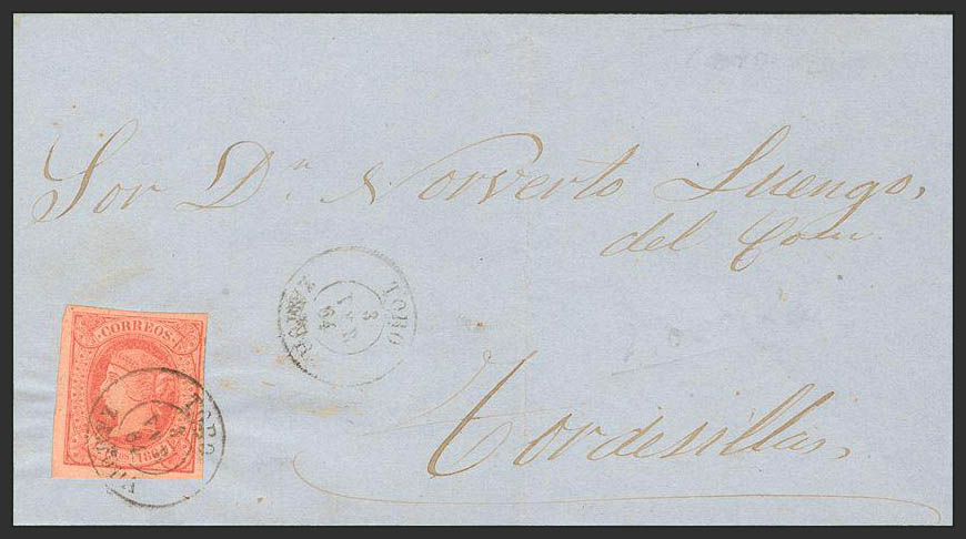 64. 1864. 4 cuartos pink. BULL to TORDESILLAS. TORO / ZAMORA postmark. MAGNIFICENT.