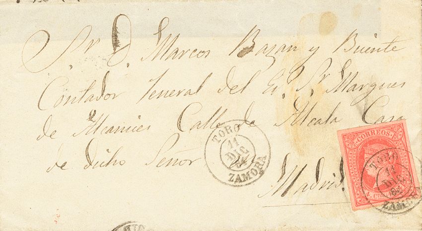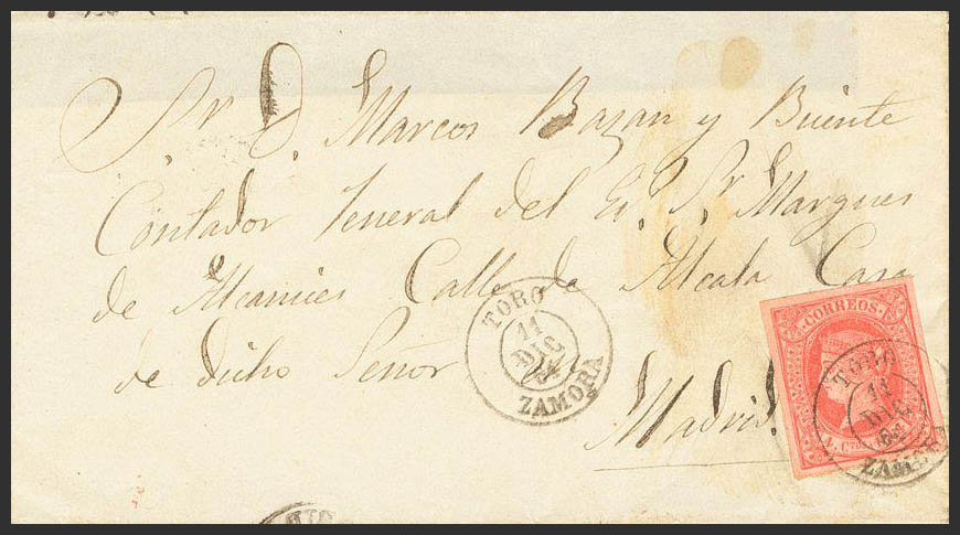 64. 1864. 4 red cuartos . BULL to MADRID. TORO / ZAMORA postmark. MAGNIFICENT.