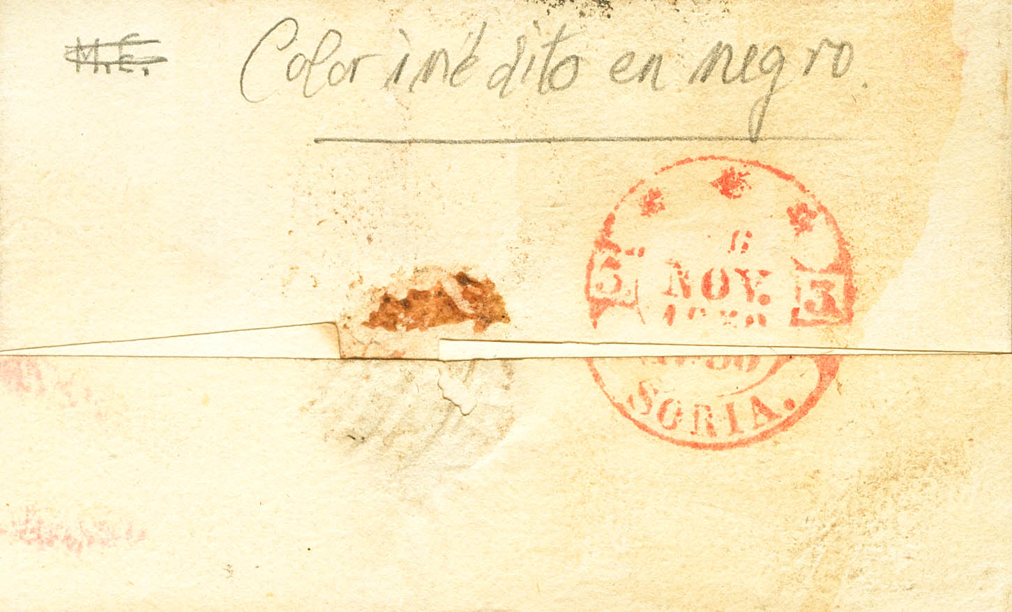 |ABOUT| 1. 1850. 6 black quarters. MEDINACELI to SORIA. Postmark SPIDER, in red and on the front Baeza MEDINACELI / SORIA, in blackish brown. MAGNIFICENT AND VERY RARE.
