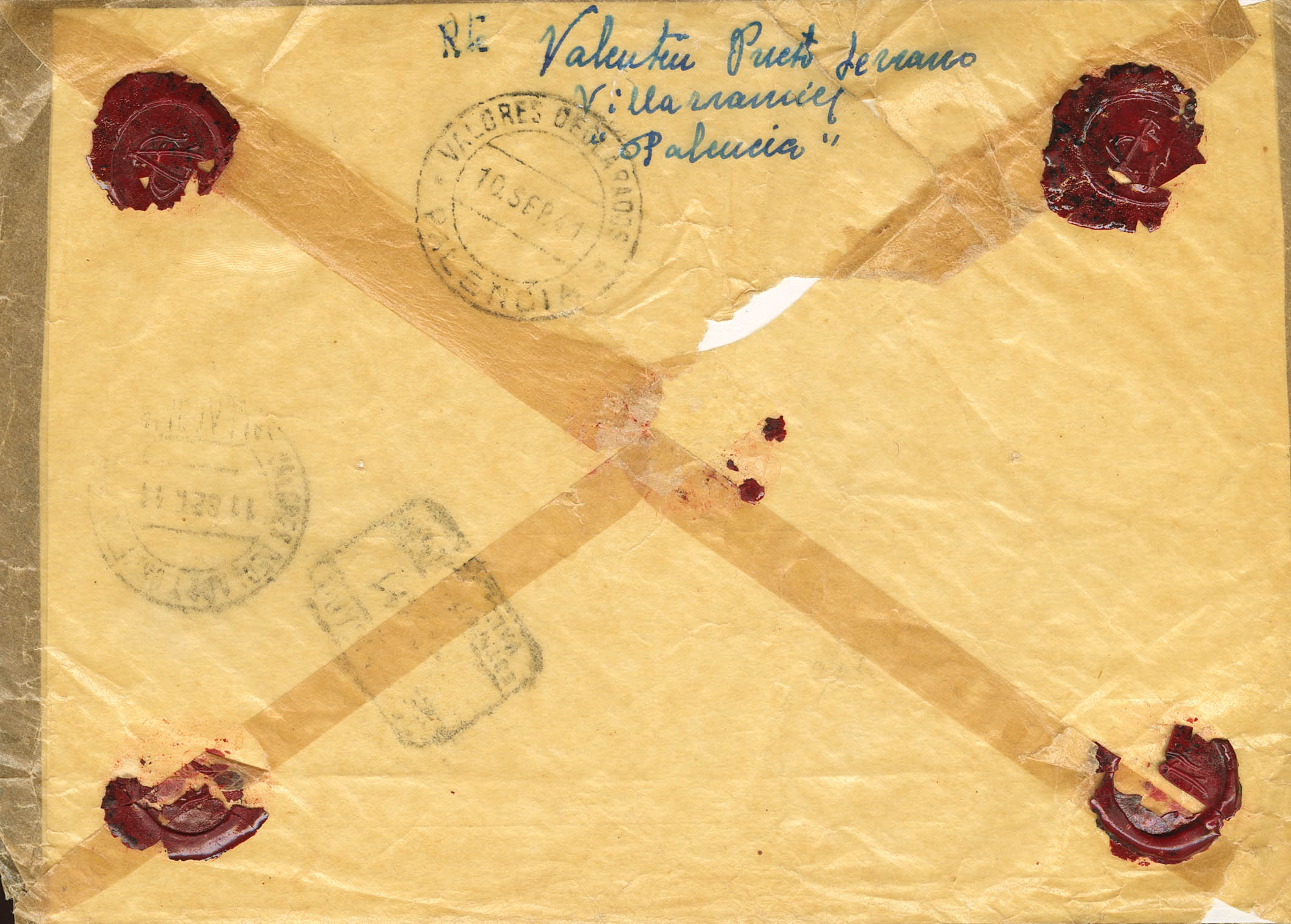 |ENVELOPE| 925(3). 1941. 40 cts green-gray, three stamps. Declared values from VILLARRAMIEL (PALENCIA) to VALLADOLID. Arrival on the back. MAGNIFICENT.