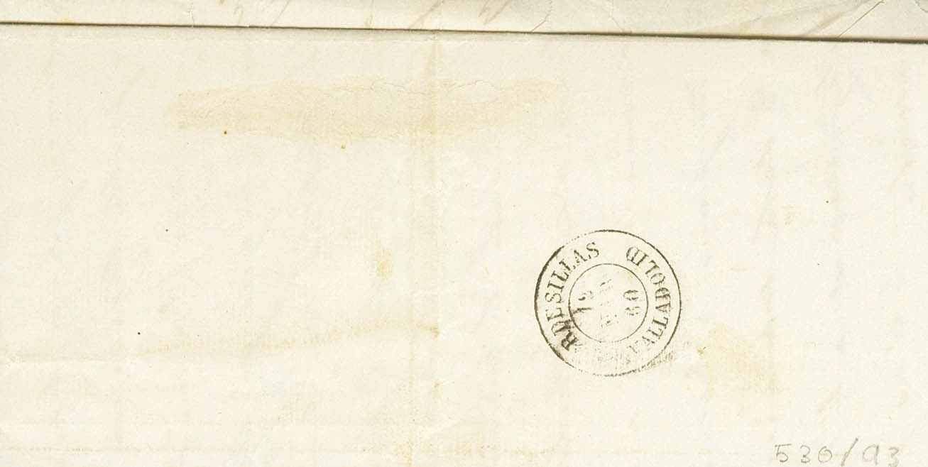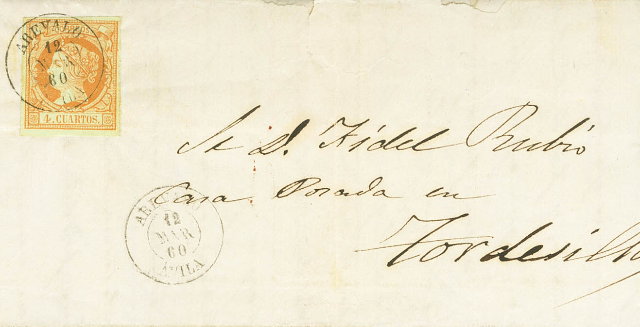 |ABOUT| 52. 1860. 4 orange quarters. AREVALO to TORDESILLAS (VALLADOLID). Postmark AREVALO / AVILA. MAGNIFICENT.