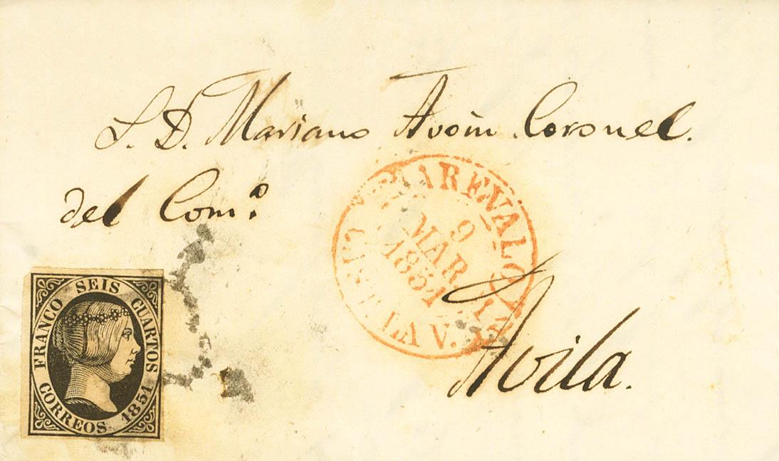 |ABOUT| 6. 1851. 6 black quarters. AREVALO to AVILA. On the Baeza front AREVALO / CAST.LA V., in red. MAGNIFICENT.