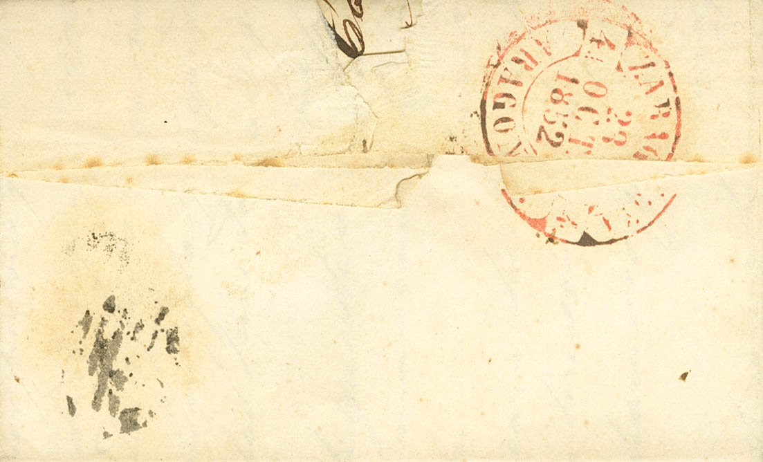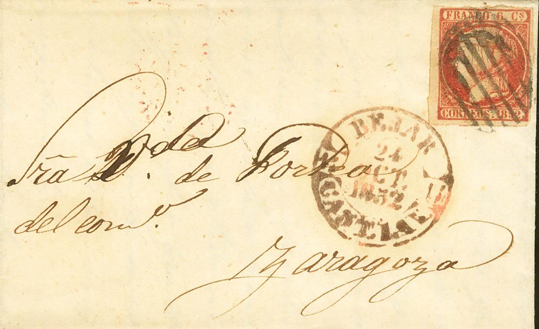 |ABOUT| 12. 1852. 6 pink quarters. BEJAR to ZARAGOZA. On the front Baeza BEJAR / CAST.LA V., in red. MAGNIFICENT.