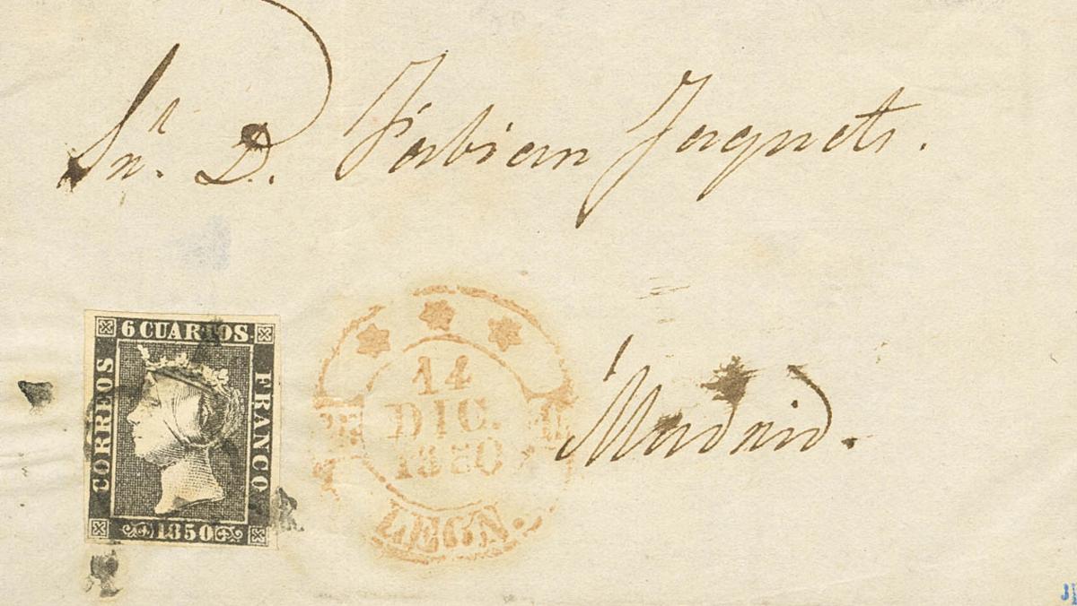 |ENVELOPE| 1A. 1850. 6 black quarters. Front from LEON to MADRID. On the front Baeza *** / LEON, in red. MAGNIFICENT.