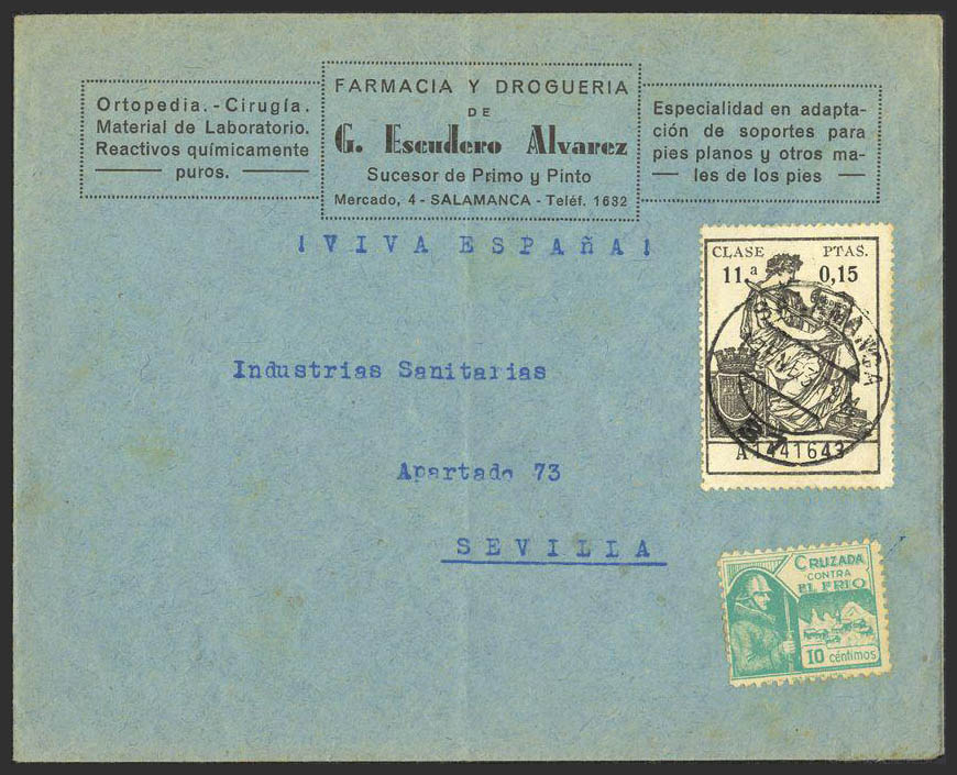 Fis 17. 1937. 15 cts POLICY. SALAMANCA to SEVILLE. On the back arrival. MAGNIFICENT.
