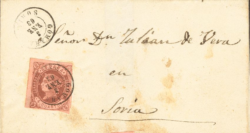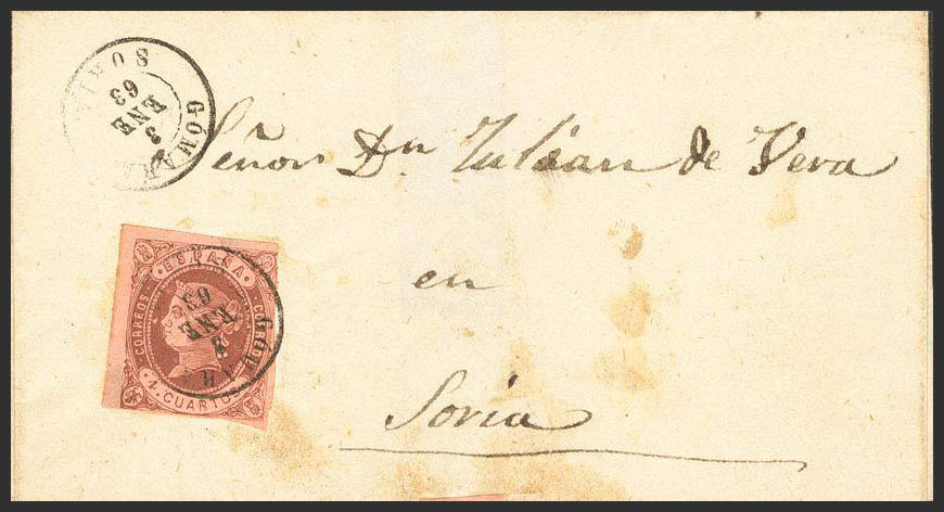 58. 1863. 4- cuartos chestnut. GOMARA to SORIA. Postmark GOMARA / SORIA. MAGNIFICENT AND RARE.