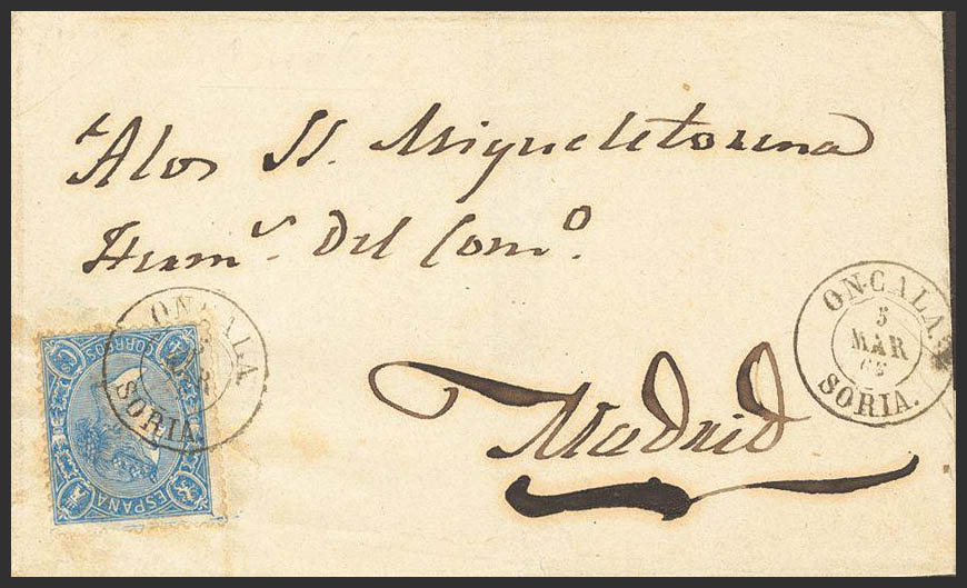 English 75. 1765. 4 cuartos blue. ONCALA to MADRID. Postmark ONCALA / SORIA. MAGNIFICENT AND RARE.