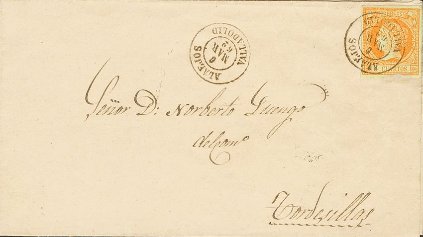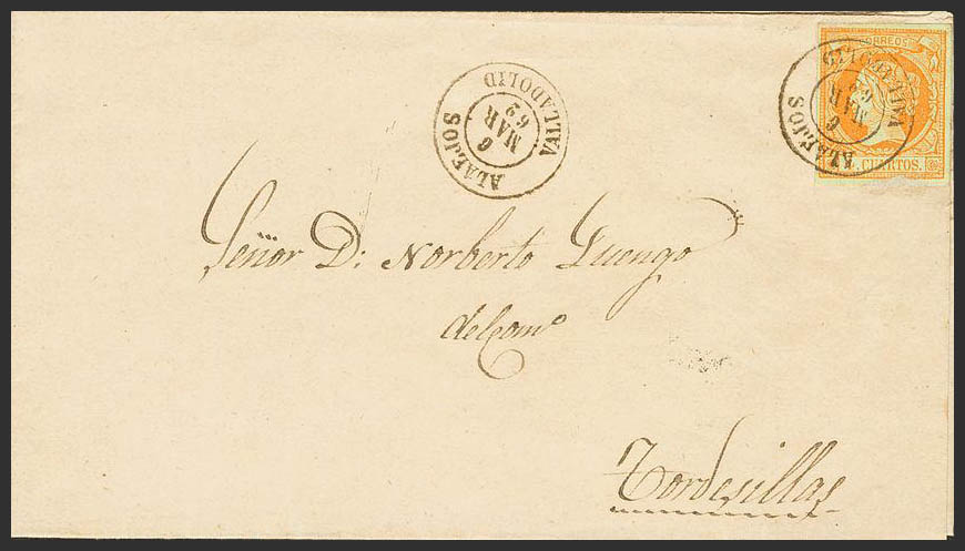 English 52. 1862. 4 cuartos yellow. ALAEJOS to TORDESILLAS. Postmark ALAEJOS / VALLADOLID. MAGNIFICENT AND RARE.