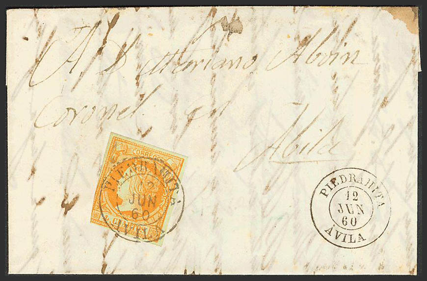 52. 1860. 4 orange cuartos . PIEDRAHITA to AVILA. Postmark PIEDRAHITA / AVILA (Type I), on the front PIEDRAHITA / AVILA (Type II). MAGNIFICENT.