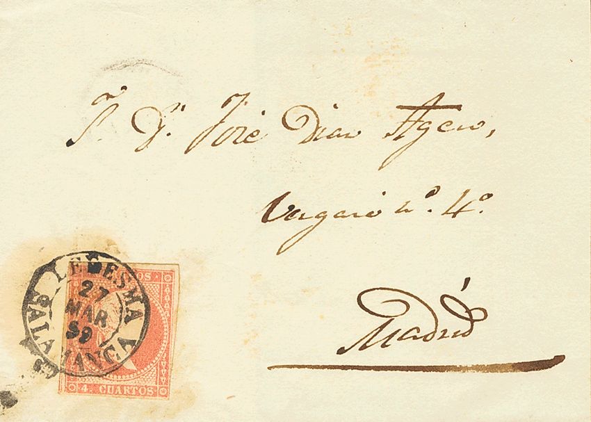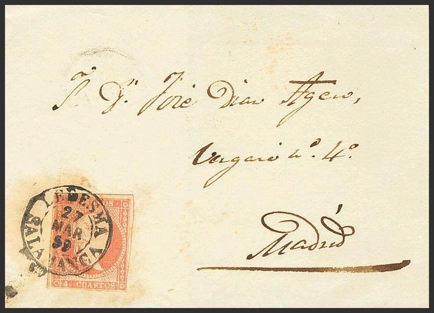 48. 1859. 4 red cuartos . LEDESMA to MADRID. Postmark LEDESMA / SALAMANCA (Type I). MAGNIFICENT AND EXTRAORDINARILY RARE.