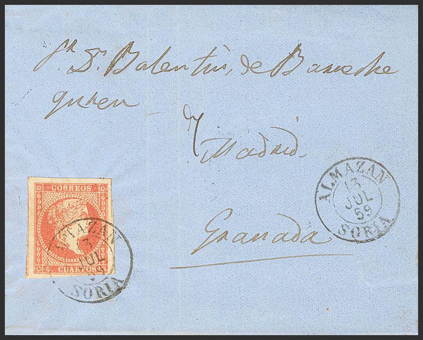 48. 1859. 4 red cuartos . ALMAZAN to GRANADA. Postmark ALMAZAN / SORIA (Type I). MAGNIFICENT AND RARE.