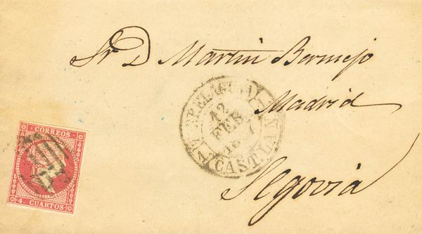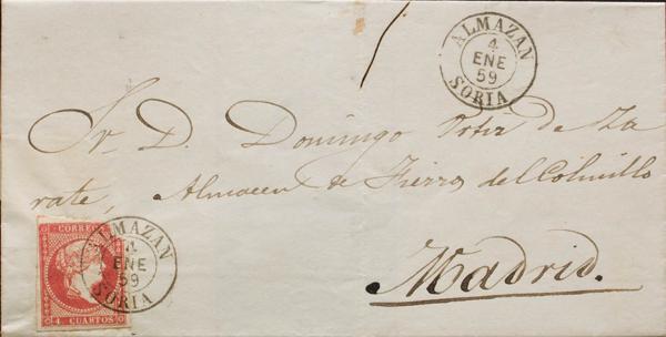 48. 1859. 4 red cuartos (minor flaws). ALMAZAN to SORIA. Postmark ALMAZAN / SORIA (Type I). MAGNIFICENT AND RARE, SPECTACULAR STAMPING.