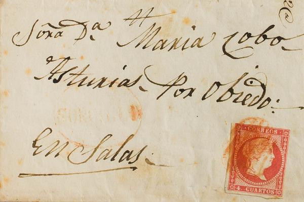 48. (1856ca). 4 red cuartos . SONCILLO (BURGOS) to SALAS. Postmark GRILL, in red and on the front SONCILLO, in red. MAGNIFICENT AND EXTREMELY RARE RED GRILL COMBINED WITH A PREFILATELICA MARK.