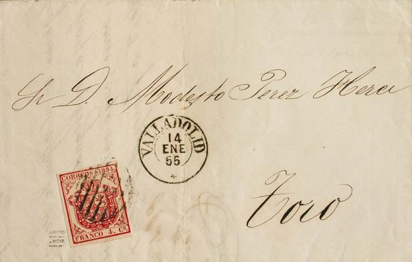 |ABOUT| 24. 1854. 6 carmine quarters. VALLADOLID to MARTIN MUÑOZ (SEGOVIA). On the Baeza front VALLADOLID / CAST.LA V. MAGNIFICA.
