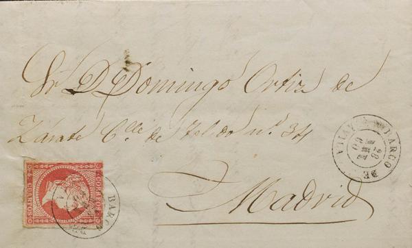 |ABOUT| 17. 1853. 6 carmine quarters. BURGOS to ARROYO DEL PUEGoodO (CACERES). On the front Baeza *** / BURGOS, in red. MAGNIFICENT.