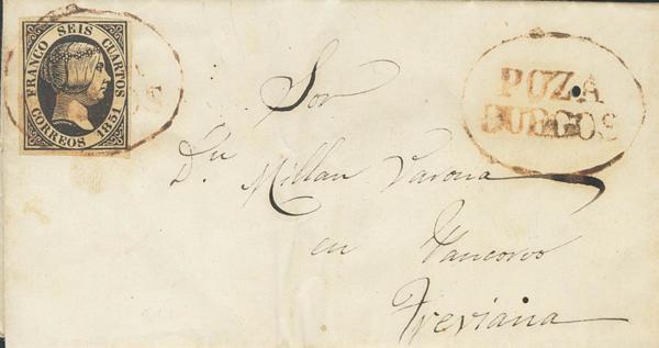 6. 1851. 6 cuartos black. POZA DE LA SAL to TREVIANA (LA RIOJA). POZA / BURGOS pre-philatelic postmark, in red. MAGNIFICENT AND RARE. Cert. EXFIMA.