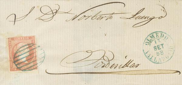 48. 1858. 4 cuartos red. OLMEDO to TORDESILLAS. PARRILLA postmark, in blue. MAGNIFICENT AND SPECTACULAR.
