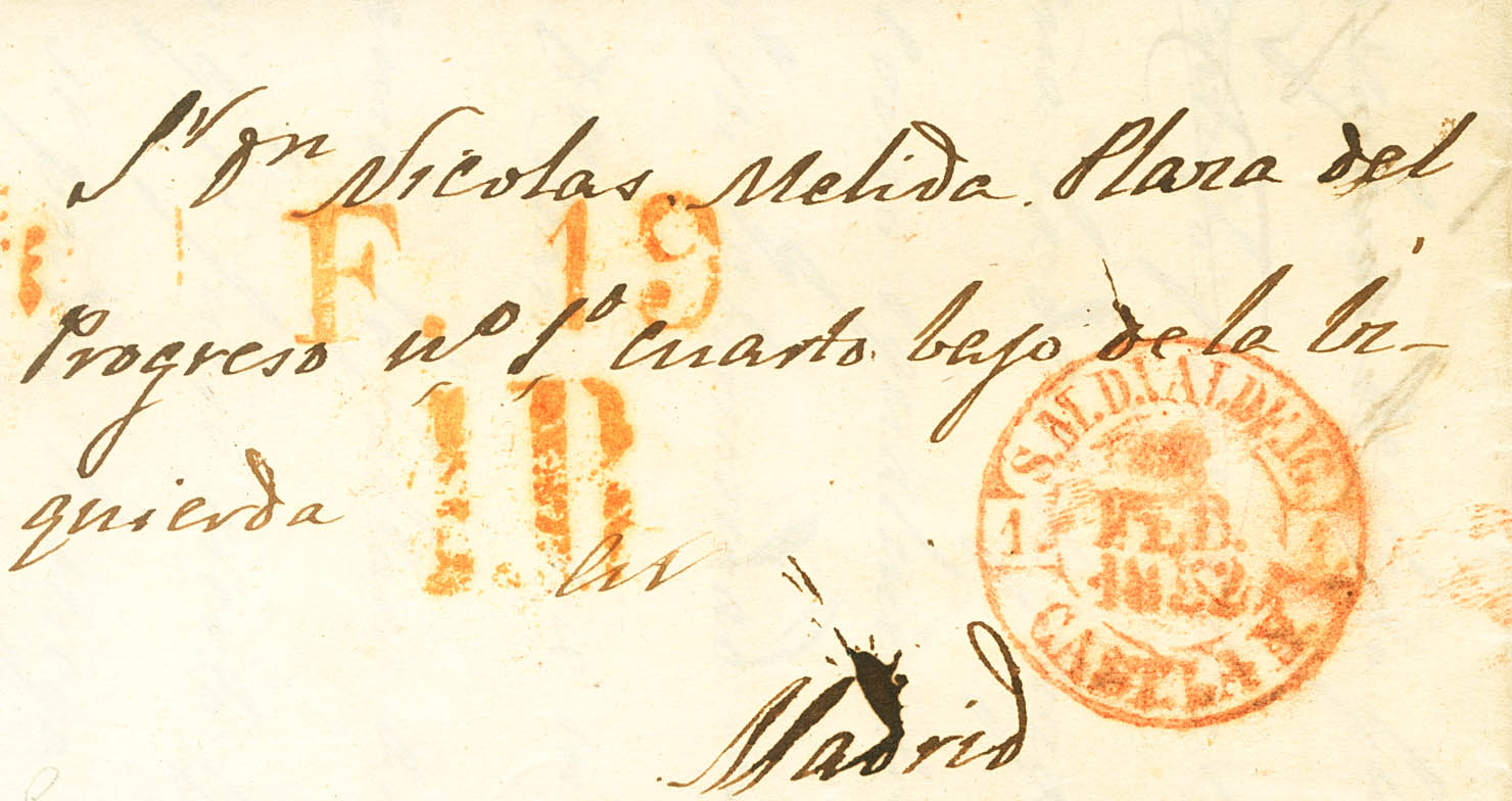 |ABOUT|1852. CEBREROS (AVILA) to MADRID. Baeza SMDVALDEIG. / CAST.LA N, in red. MAGNIFICENT AND VERY RARE.