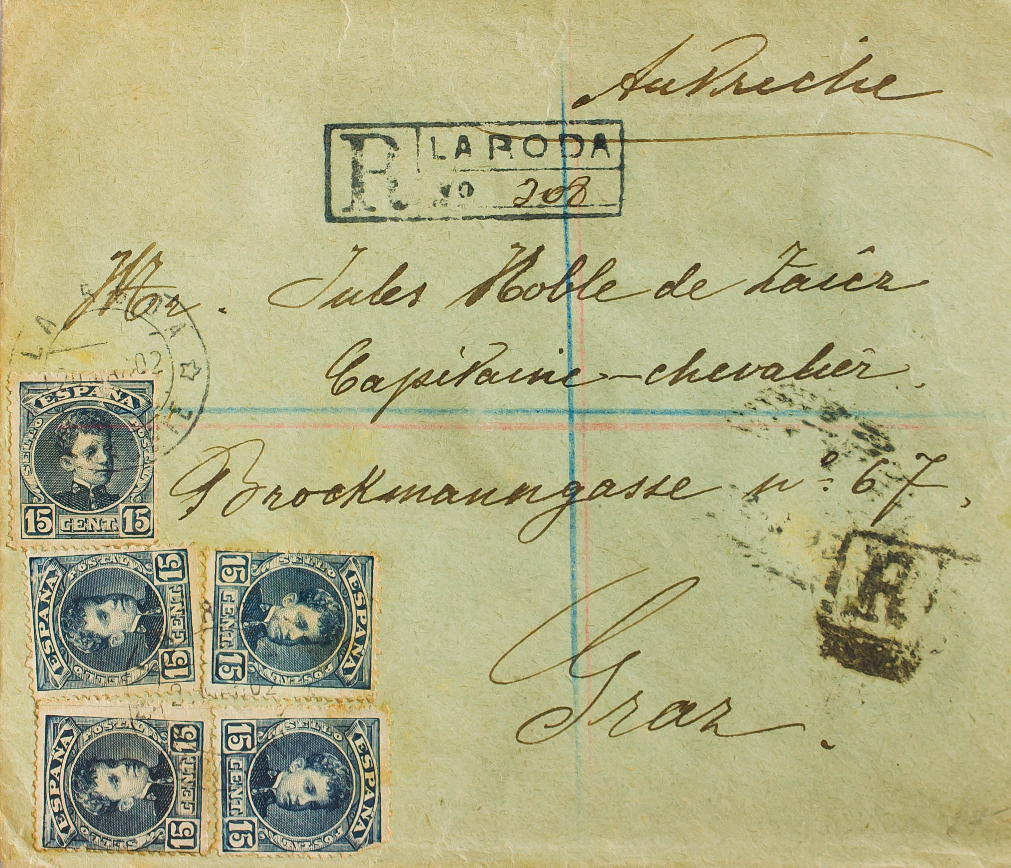 244(5). 1902. 15 cts blue black, five stamps (one with a small defect, for information only). Certificate from LA RODA to GRAZ (AUSTRIA). On the back arrival. MAGNIFICENT.