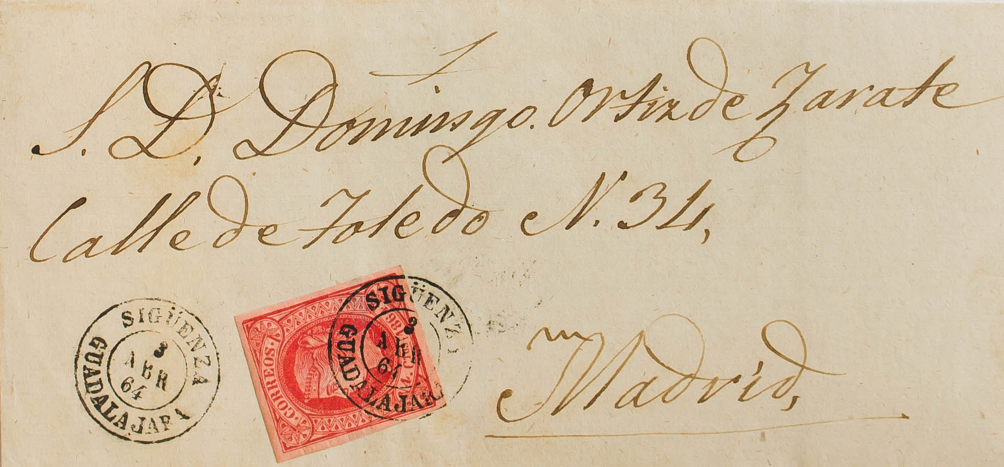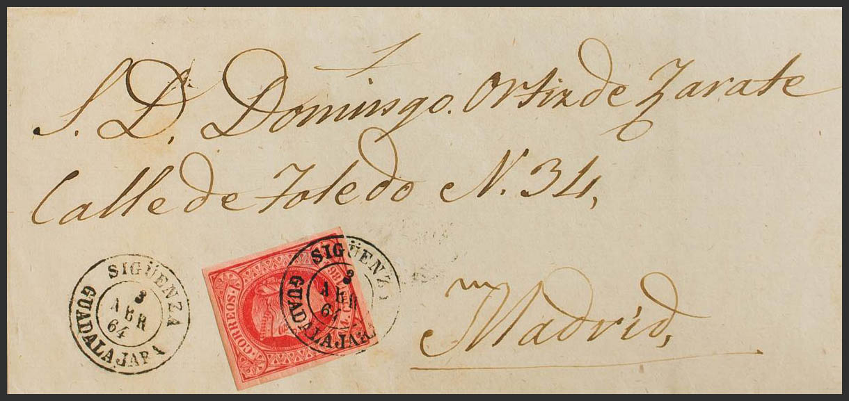 64. 1864. 4 red cuartos . FOLLOW MADRID. Postmark SIGÜENZA / GUADALAJARA. MAGNIFICENT.
